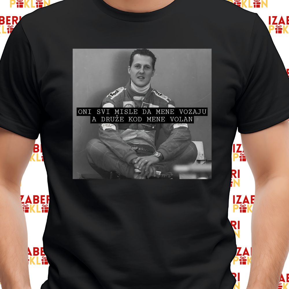 Pamučna majica sa printom “Kod mene je volan” u crnoj i beloj boji.