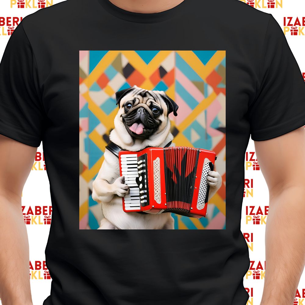 Pamučna majica sa printom “Pug Play Accordion” u crnoj i beloj boji.
